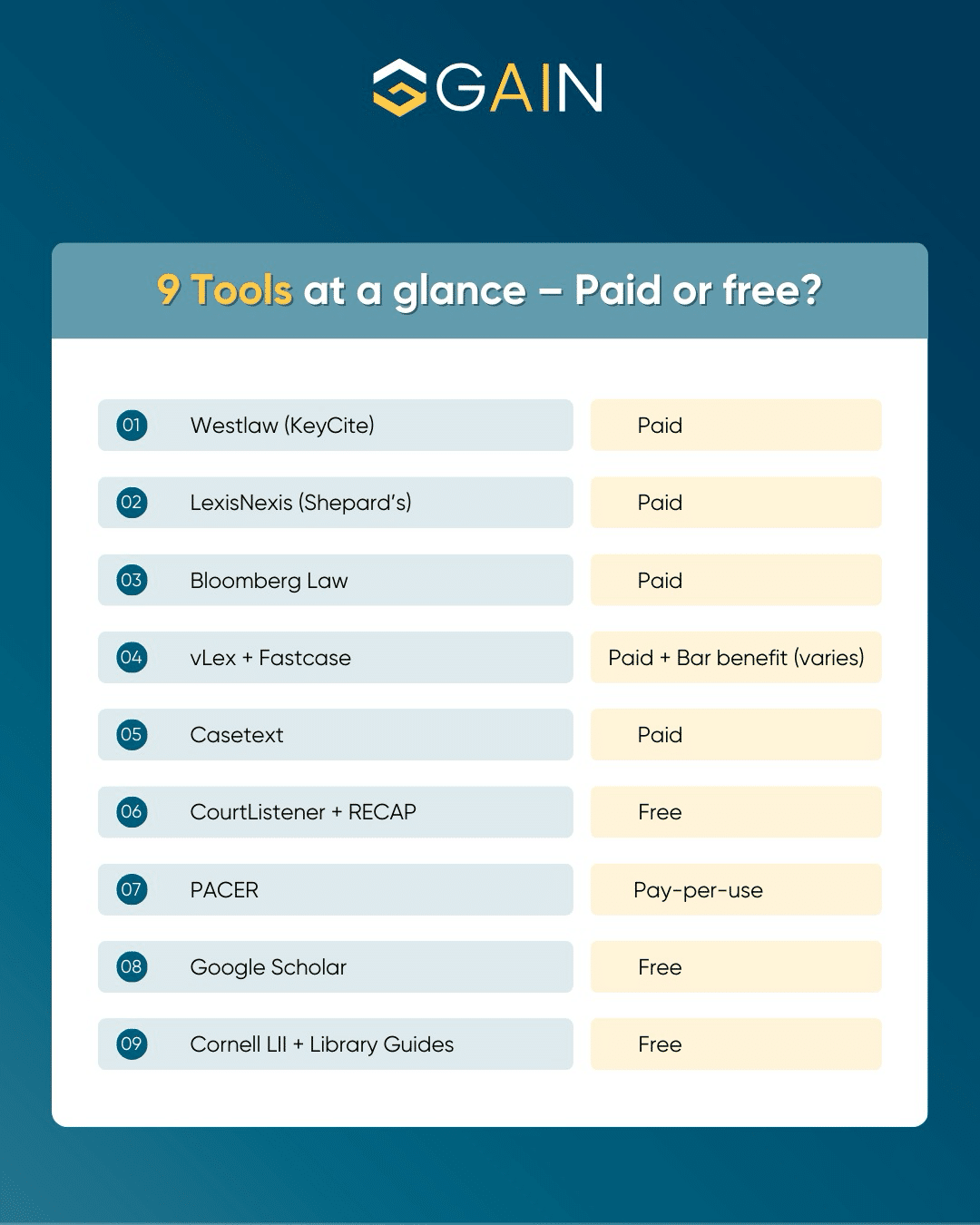Legal Research Tools are online platforms that help you quickly find, verify, and apply case law and dockets to build citation-ready arguments. Examples include Westlaw (KeyCite), LexisNexis (Shepard’s), Bloomberg Law, vLex + Fastcase, Casetext, PACER, CourtListener/RECAP, Google Scholar, and Cornell LII. They speed research, validate authority, and streamline drafting.